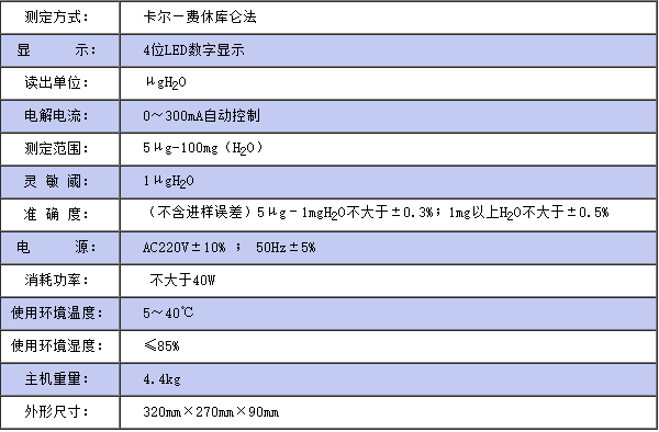 仪器符合GB/T7600;SH/T0246;GB/T606及采用卡尔—费休法测定样品中水分的有关标准。仪器采用了先进的自动控制电路,电