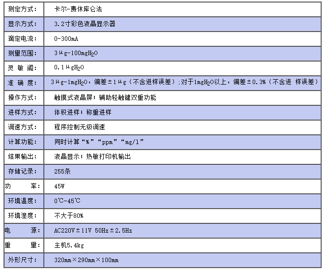 仪器符合GB/T7600及采用卡尔—费休法测定样品中水分的有关标准, 是采用先进技术研发的,全新的具有人机对话功能新一代水分测定仪器。该仪器采用了双CPU控制、彩色液晶显示、触摸屏控制、中文菜单,具有电极开路、短路报警等故障自检功能,可储存255条信息,具有自动计算百分含量、PPM值、自动打印功能。