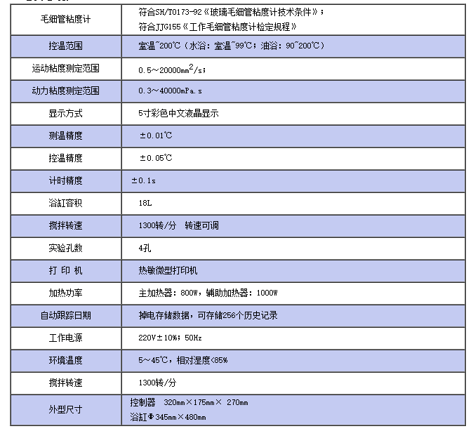 仪器符合GB/T265标准,也适用GB1841标准所规定的塑料树脂等其他产品的运动粘度。仪器采用先进的单片机、彩色中文液晶显示,温度控制准确、精度高,自动计时、自动计算运动粘度和动力粘度、自动打印测定结果,外形结果新颖,是一款国内较先进的运动粘度测定仪。